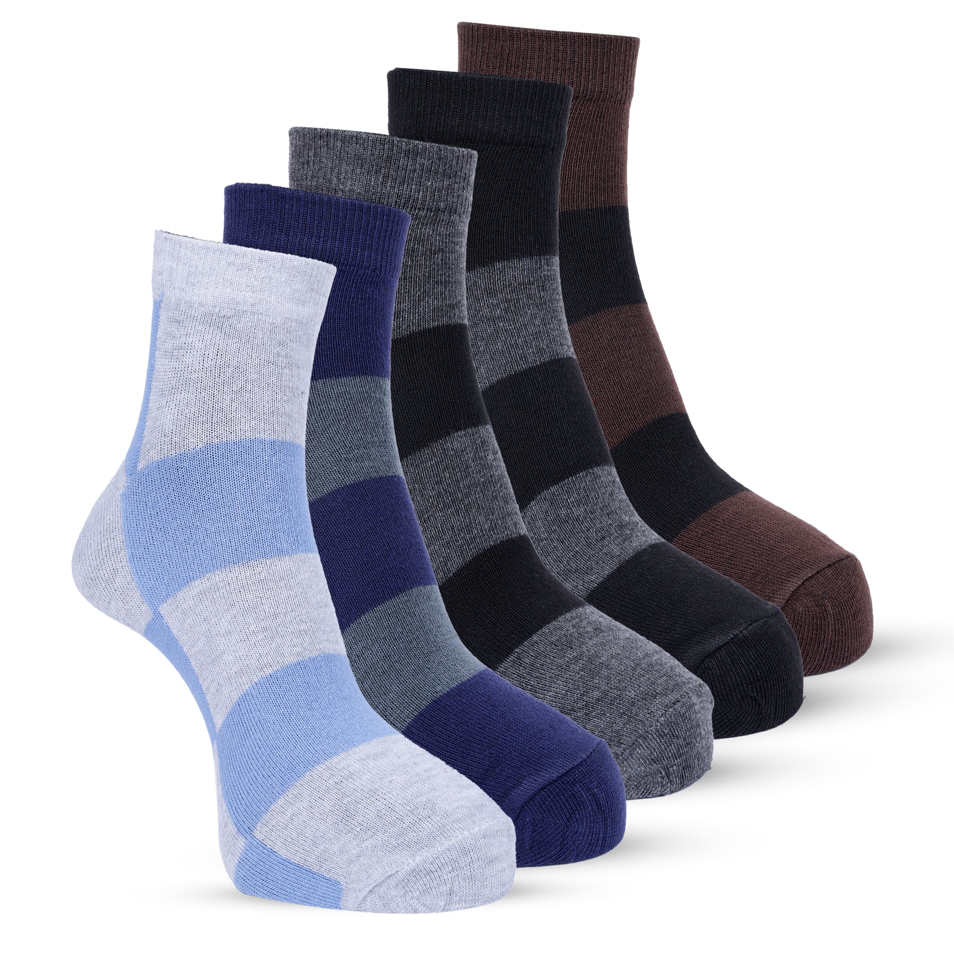 Elevate your sock game with this stylish set of five pairs of men's socks featuring a trendy mix of blue, grey, and brown stripes. Perfect for adding a touch of personality to any outfit, these socks are designed for comfort and durability, making them an essential addition to your wardrobe.