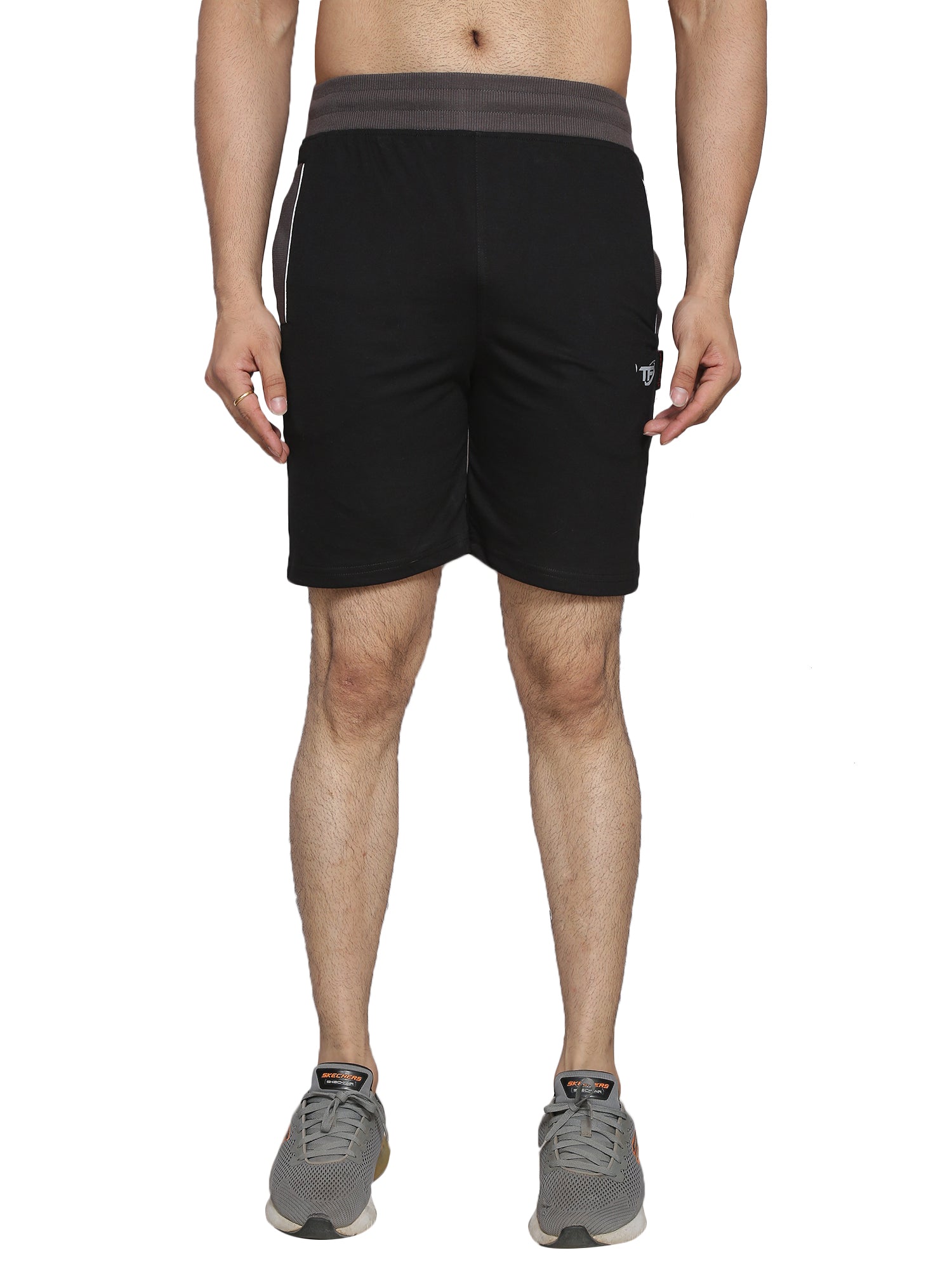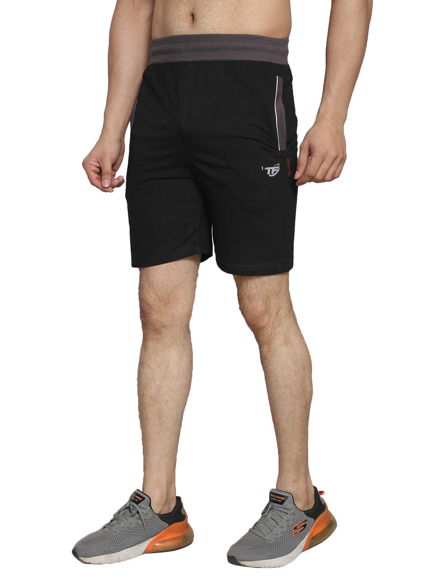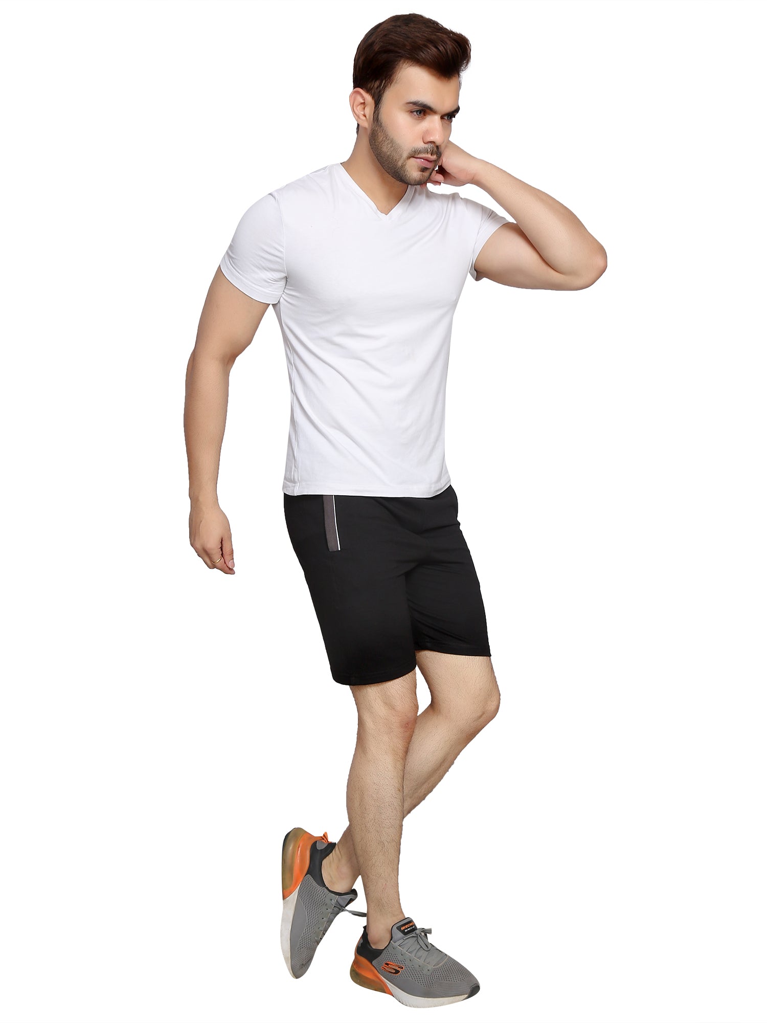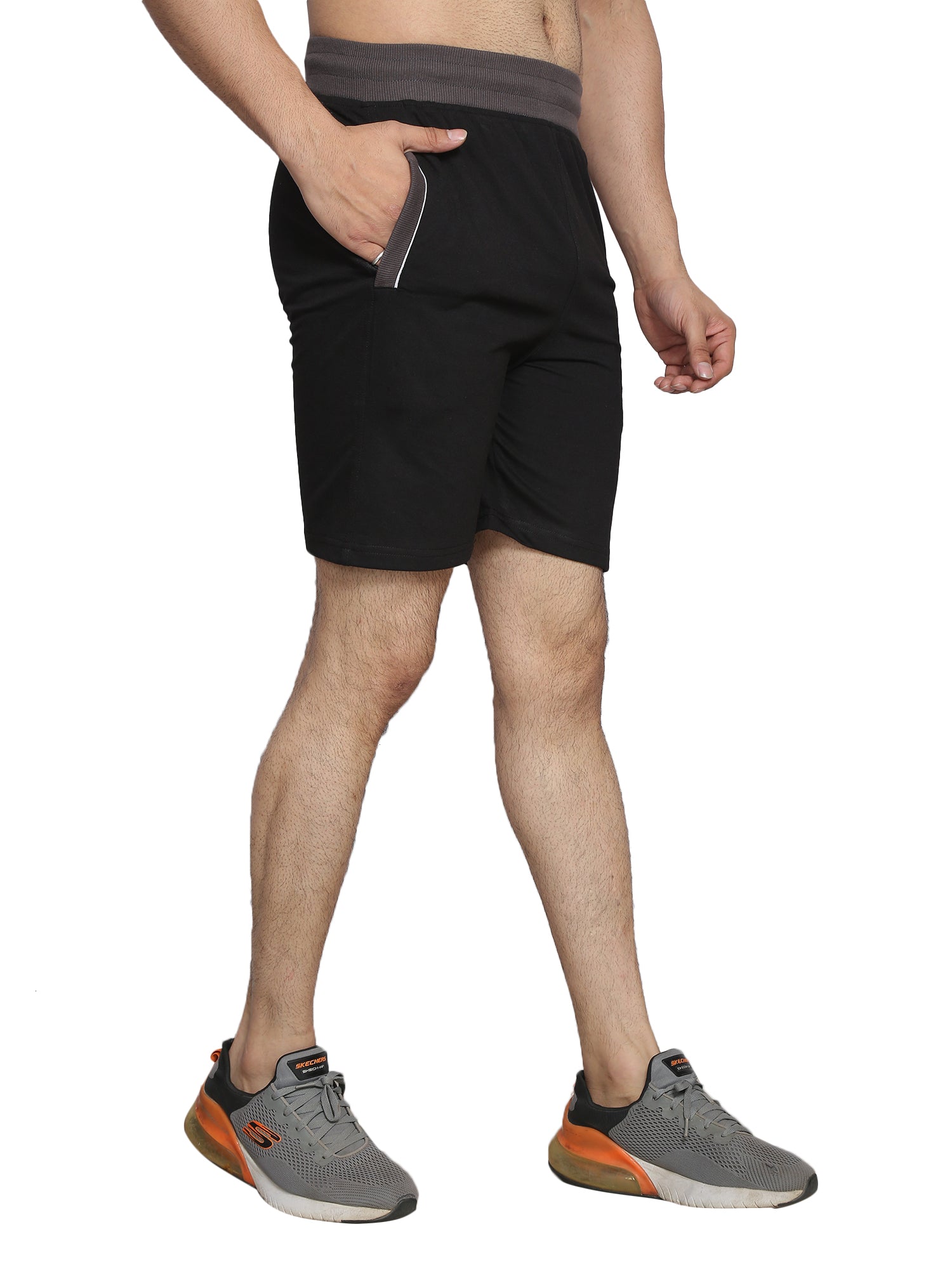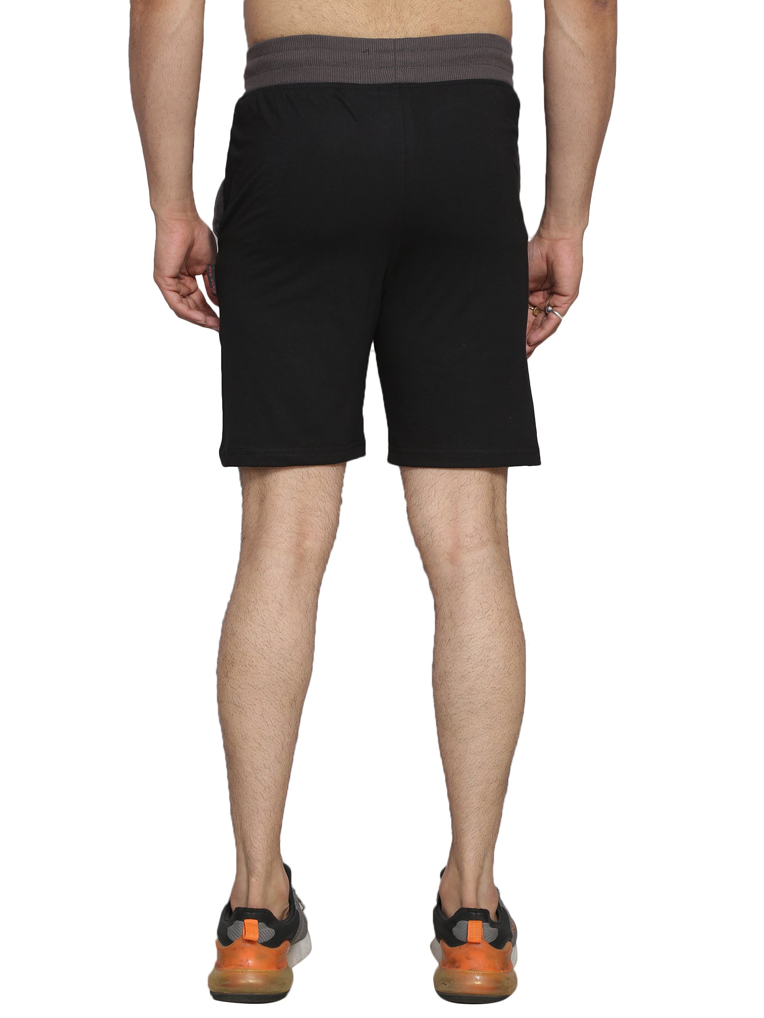 This stylish ensemble features a man confidently sporting grey shorts. The combination of neutral and bold colors creates a striking visual appeal, perfect for casual outings or athletic activities. The lightweight fabric of the shorts ensures comfort and breathability, making this outfit both functional and fashionable. Ideal for those seeking a blend of style and practicality in their wardrobe.