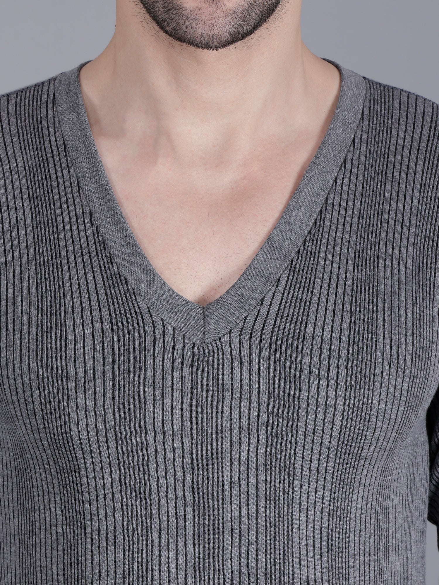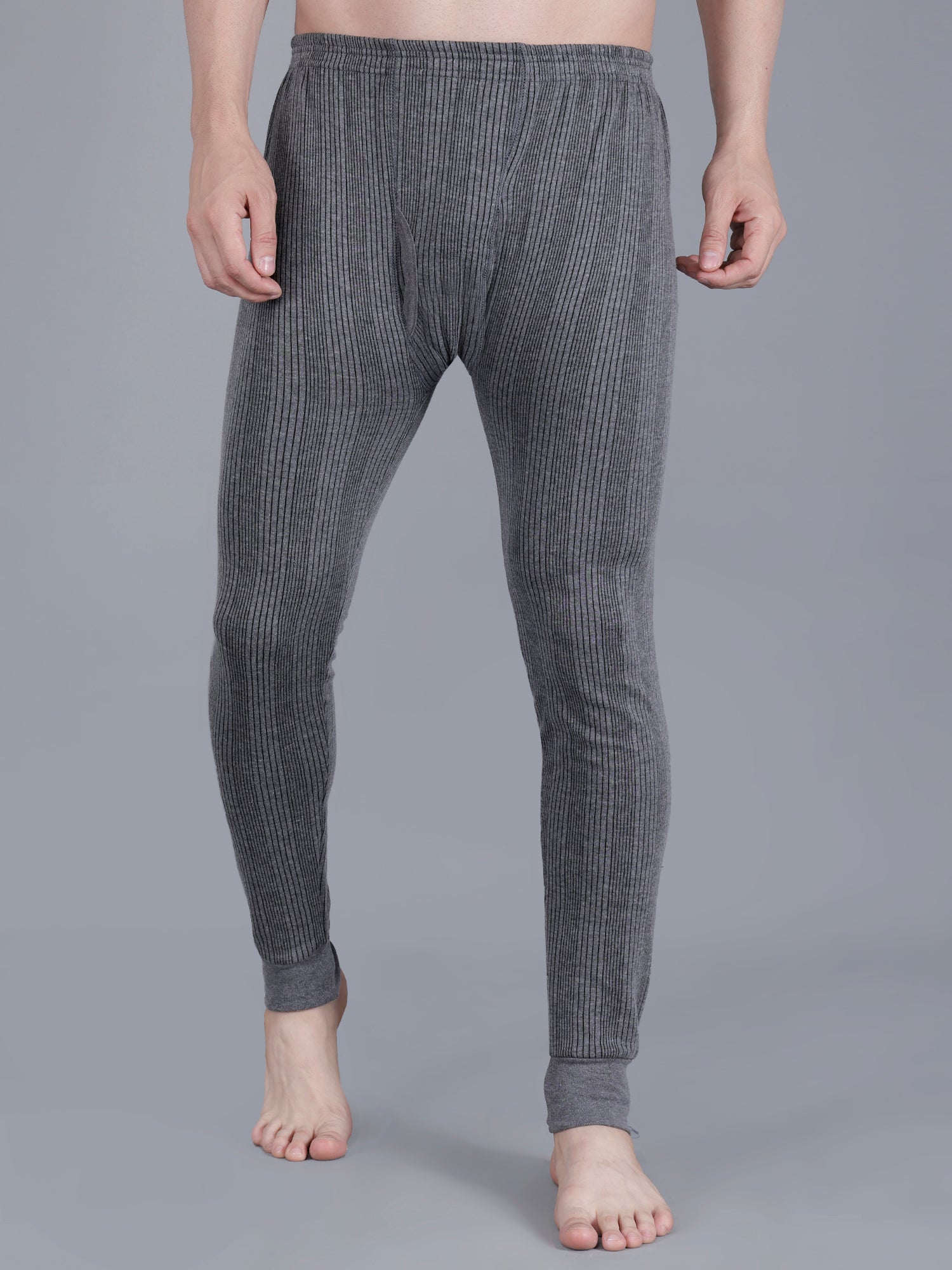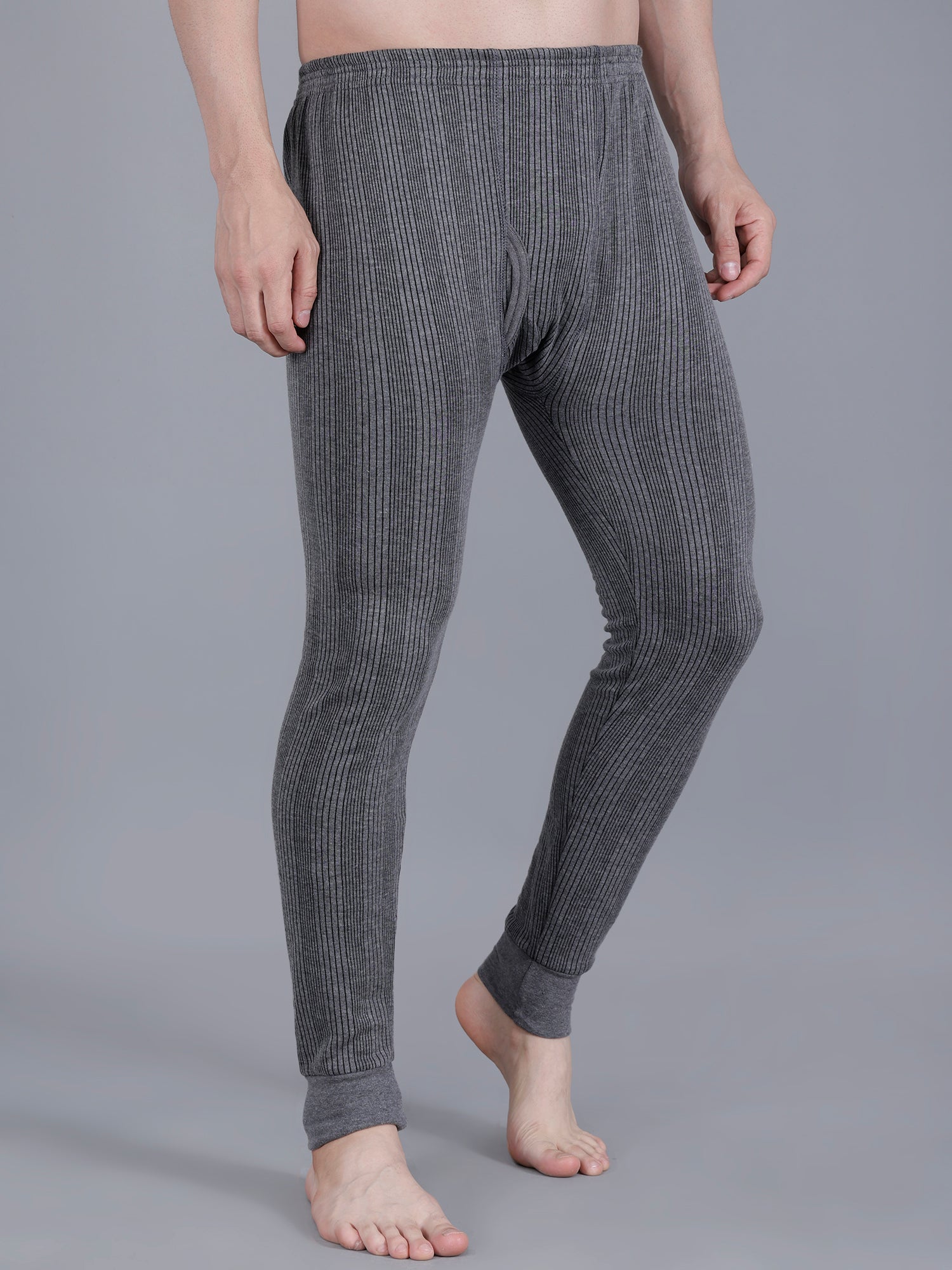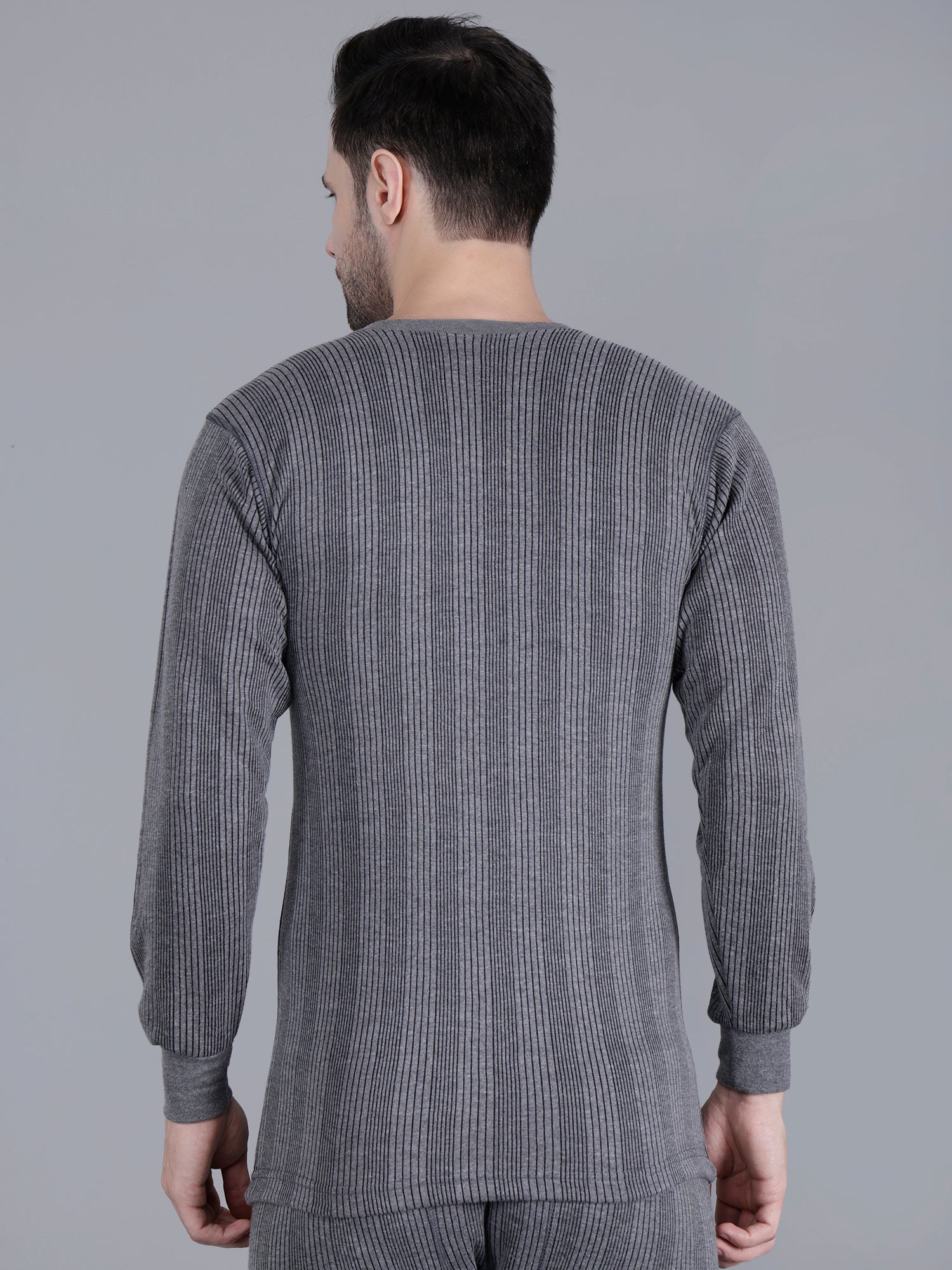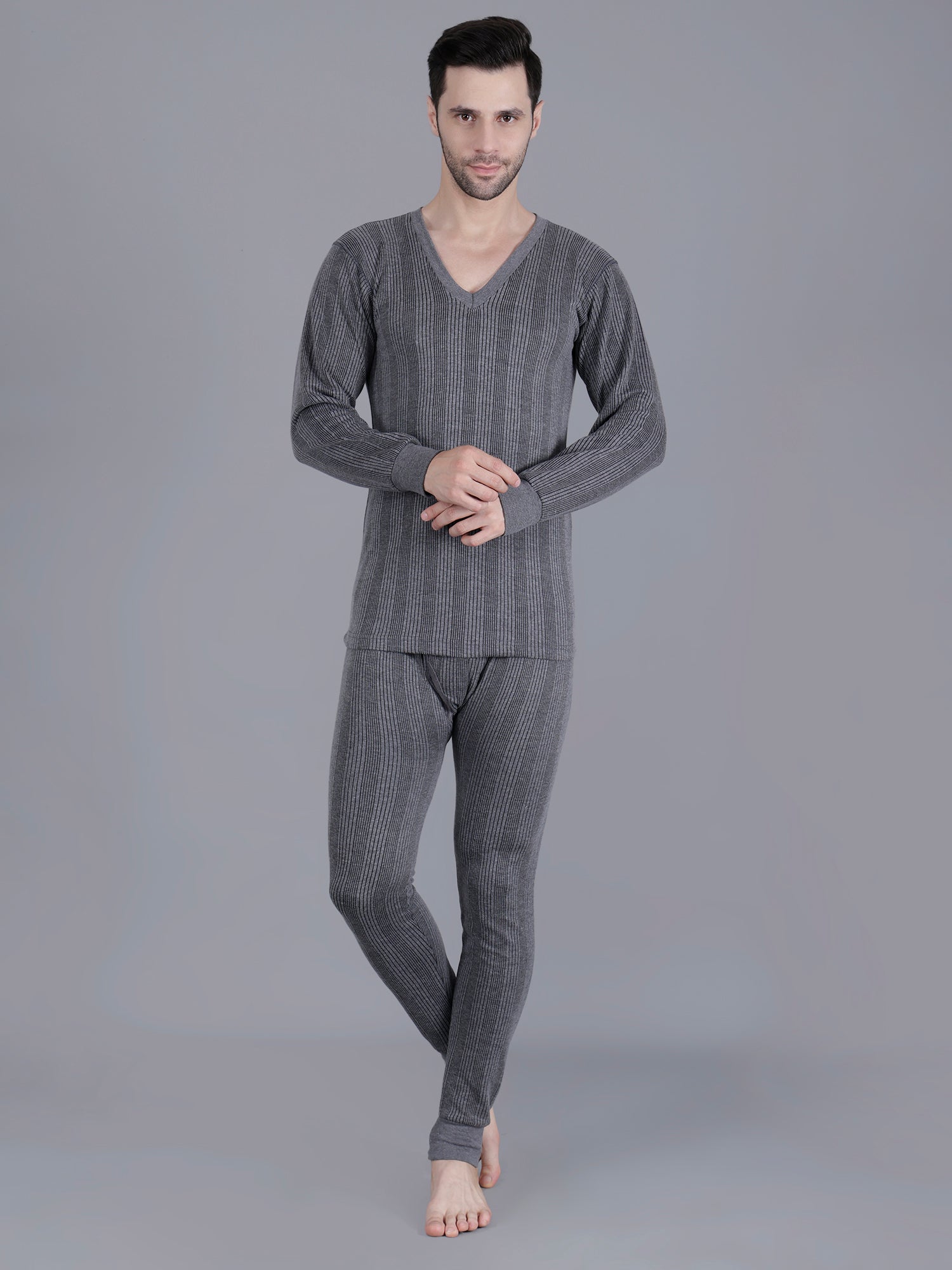 The grey striped thermal top has a V-neck, long sleeves and cuffed hem to keep warmth locked in. Similarly, the grey striped mid-rise full length thermal bottoms, has an elasticated waistband and cuffed hem. Ideal for chilly mornings and cool evenings, this body warmer set is a must-have wardrobe essential for every man seeking warmth, style, and comfort in one versatile piece.